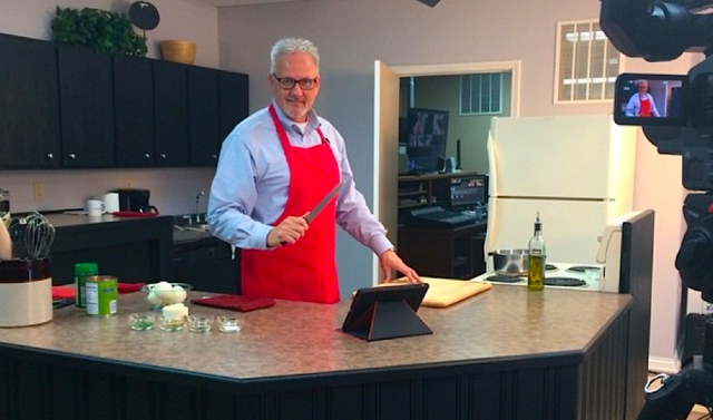 2015-03-03 - WLCU Broadcast Studios, 203 West Broadway, Campbellsville, KY - Photo from WLCU student promotions. Some know Dave Walters as pastor at Lowell Avenue Baptist Church in Campbellsville. Some know him as vice president for admissions and student services at Campbellsville University. Others will say he is half of the Dave n Ed Show, a comedy produced annually with his partner Rev. Ed Pavy. Now, in addition to those, Walters will be known as the chef of "Cooking with Dave," the cooking show on WLCU television that follows in the tradition first started by Ed McGuire. Walters said he has attended culinary arts school which gives him some credentials. Linda Waggener, CU
