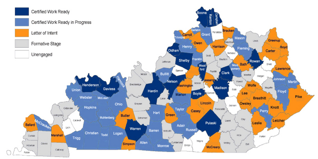 2015-03-03 - Frankfort, KY - Photo from Kentucky Work Ready Communities Program. The chart above shows status of the 7-County Area: Adair, Russell and Taylor are Work Ready Communities in Progress; Green and Casey have sent letters of intent. And Cumberland and Metcalfe are in Formative Stages. Around the state, only a few counties are unengaged in the program