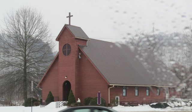 2015-03-03 - Corner Wallace Wilkinson Boulevard and KY 70, Liberty, KY - Photo by Ed Waggener. From any angle, one of the most beautiful sanctuaries anywhere, anytime, and especially in Sunday's snow: Sacred Heart Parish Church in Liberty, KY. Picture through the passenger's side windshield with windshield distortions. Sunday, 1 Mar 2015