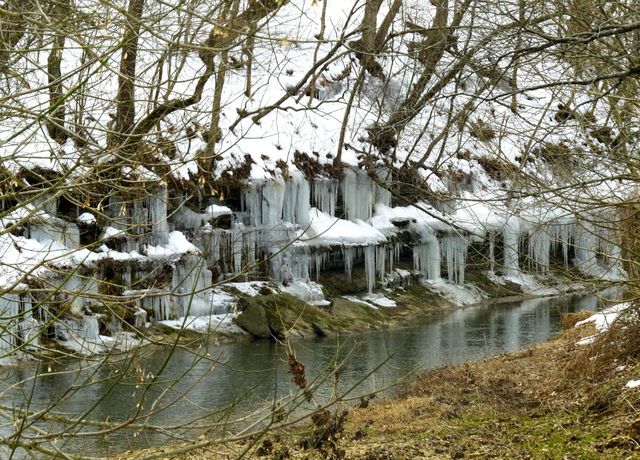 2015-03-02 - Putman County, Adair Co. District One, Columbia, KY - Photo by Ed Waggener. Searching for winter pictures Saturday, we spotted this double bank of giant draped icicles, the kind which tempt one to stop the car and see what happens when one is pulled down. Fearing possibly lethal consequences, the urge was quelled. The bank is along Sulphur Creek - to the best of our knowledge - and is in the Putman County section of Adair County. The late Renaissance Man, Dr. W.K. Neat, Varmintologist and Man of Science, and well versed in all matters of travel, was once ask to define the limits of the county within a county. "Oh," he said, "you'll know when you get there. It just greens out at you." That's how we found the magical, mythical kingdom of a Saturday, 28 Feb 2015, on a Know Your County Better Tour. It just greened out at us. - EW