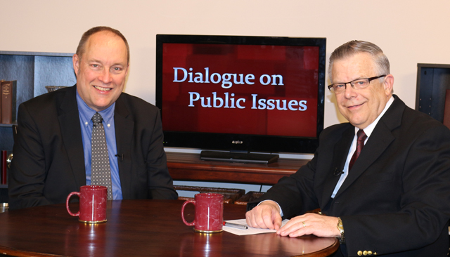 2015-02-26 - WLCU Broadcast Studios, 203 West Broadway, Campbellsville, KY - Photo by Drew Tucker, CU . Campbellsville University's Dr. John Chowning, vice president for church and external relations and executive assistant to the president of CU, right, interviews Dr. Galen Carey, vice president vice president of government relations for the National Association of Evangelicals, his "Dialogue on Public Issues" show. The show will air Monday, March 2 at 1:30pmET and 6:30pmET and Wednesday, March 4 at 1:30 pmET and 7pmET on WLCU-TV, on Campbellsville's cable channel 10 and at 8 amET and at 6:30 pmET Sunday, March 1 on both WLCU-TV and on 88.7 The Tiger radio. - JOAN C. McKINNEY, CU