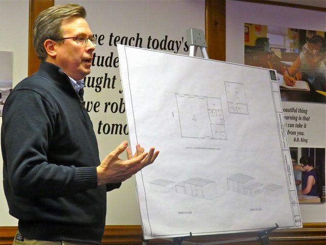 2015-02-24 - 1204 Greensburg Street, Columbia, KY - Photo by Ed Waggener. Gabe Jones, architect with Sherman-Barnhardt-Carter, Architects, present the schematic for the proposed Adair County School District Bus Garage. The drawing shows an option in the upper right hand corner for a new maintenance building, which would replace the present one at 350 Indian Drive, but the inclusion of that building at this time would exceed the District's present bonding capacity. "So," Supt. Alan Reed said," it is not likely at the time." Still he said, It will be part of the total plan forwarded to the Kentucky Department of Education Buildings and Grounds for approval. When the new Maintenance Building is constructed, the 350 building would be converted to house baseball after the present bus garage is torn down, Superintendent Reed said. The board voted unanimously to approve the Adair County Bus Garage. The photo was taken at the Mon 23 Feb 2015 Special Regular Meeting of the Adair County Board of Education.