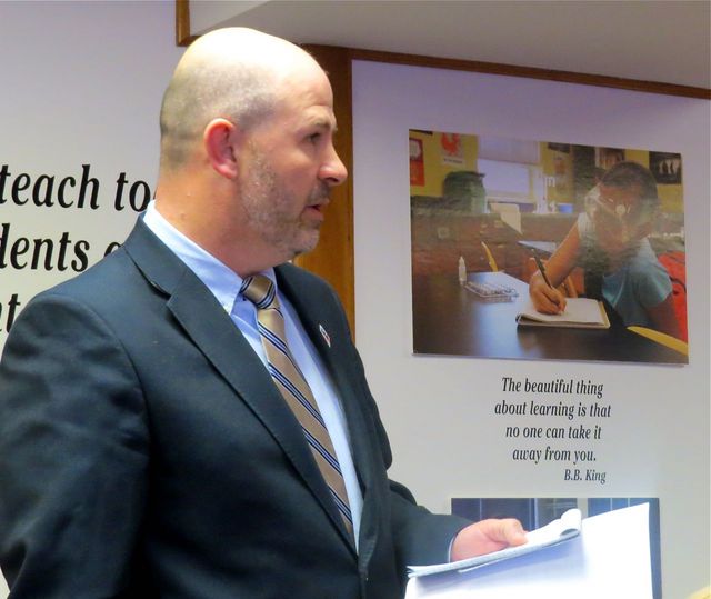 2015-02-24 - 1204 Greensburg Street, Columbia, KY - Photo by Ed Waggener. Technology Director Steve Turner advocated for a District Technology Engineer for the Adair County School District, and received unanimous approval for the new position. A salary schedule, also unanimously approved sets a minimum $30,000 per year salary schedule, with experience steps, and certification levels increases. Technology is quickly becoming a major necessity. Supt. Reed noted that the use of hand held devices has rapidly increased in the past few years, placing a new level of stress on the system. Mr. Turner cited problems in the Ag building, badly underserved - but not corrected - as one situation a District Technology Engineer would have quickly found. Presently, two technology technicians, Technology Technician Jason Rector and Technology Technician Assistant Trey Grider, work on a "Break & Fix" protocol. Something breaks, they fix it. The Technology Engineer would be a planning and prevention position, anticipating problems before the system breaks down. The position will be posted soon, with the District Technology Engineer, with the aim of having her or him in office by July 1, 2015. Photo taken at the Special Regular Board meeting, Mon 23 Feb 2015.