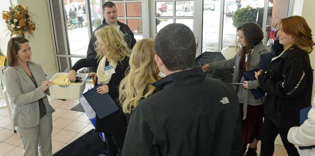 2015-02-22 - Cranmer Dining Center, 430 Helen Flatt Drive, Columbia, KY - Photo by Duane Bonifer, Lindsey Wilson College. Adair County High School's Rikki Neat of Columbia takes a plastic poncho from LWC admissions counselor Kendra Leveridge, left, Saturday morning, February 21, 2015, in the Roberta D. Cranmer Dining & Conference Center atrium during John B. Begley Scholars Day,