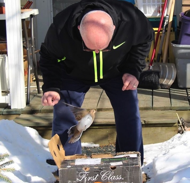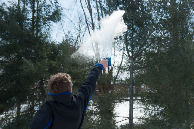 2015-02-19 - Shelbyville, KY - Photo by Pen. It's a good day to try out some nifty cold-weather science experiments. NPR has a great list of tricks. Here, Graham demonstrates one of them with a cup of microwaved water. When the temperature drops below 21 degrees Fahrenheit, boiling water thrown into the air will immediately vaporize.