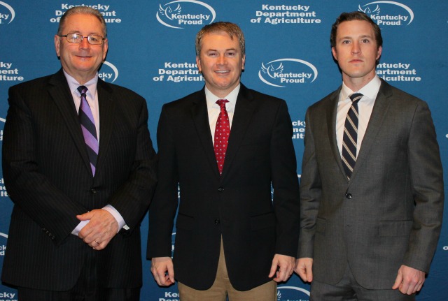 2015-02-18 - Frankfort, KY - Photo by Kentucky Department of Agriculture. State Sen. Jimmy Higdon, left, and his intern, Jeff Kinlaw, right, joined Kentucky Agriculture Commissioner James Comer for breakfast at the annual Kentucky Proud Breakfast last week at the state Capitol Annex. State legislators and their staffs enjoyed a country breakfast of Kentucky Proud food sourced from farms around the state, including bacon, biscuits and gravy, country ham, eggs, hash brown casserole, and sausage.