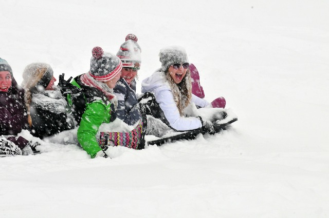 CU Women's Soccer players sledding in Miller Park