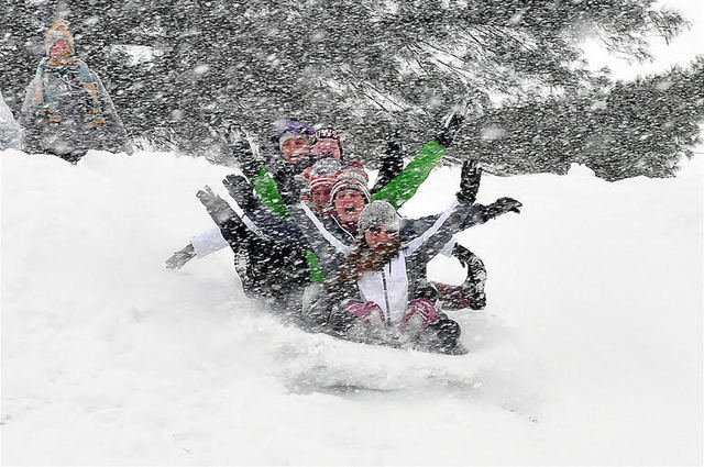 2015-02-18 - Miller Park, Campbellsville, KY - Photo Jordan Alves, Campbellsville University. Campbellsville University Womens Soccer players enjoyed Monday's blizzard in Miller Park. Sledding in the snow storm were Jade Perry, Mhairi Fyfe, Morgan Danis, Rachel Veatch and Devon Burnside. Photo by Jordan Alves, Campbellsville University Sports Information