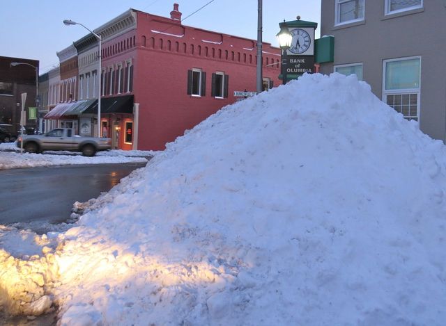 2015-02-18 - Burkesville Street exit, Public Square, Downtown Columbia, KY - Photo by Ed Waggener. Streets and Parking Places were clear last night, Tue 17 Feb 2018, when this snow mountain - one of four on Square - photo was taken. We haven't been out yet this morning, but there's a fresh layer of snow on it.