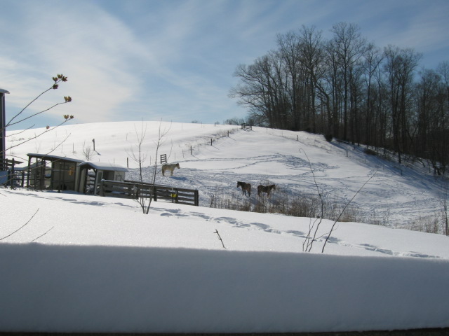 2015-02-18 - Greater Gadberry, KY - Photo by Charles Marshburn. Have love these guys. Have to love this photo. Know from a distance they are equine, so we'll call them 'Horses in the snow.' The photographer is given to being taciturn, so we're not sure at this distance, what equine church or denomination these belong to - and will humbly submit to the scathing derision some knowledgeable horse/mule/donkey/mare S/A sends and will welcome a respectful reminder of what they are. We appreciate it when we all remember we neither share the same genius or ignorance. - EW