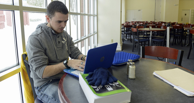 2015-02-17 - Cranmer Dining Center, 430 Helen Flatt Drive, Columbia, KY - Photo by Duane Bonifer, Lindsey Wilson College. Lindsey Wilson College student Drew Worley of Hickman, KY, works on an assignment for his "Introduction to Organismal Biology" class Monday morning in an usually quiet Roberta D. Cranmer Dining & Conference Center.