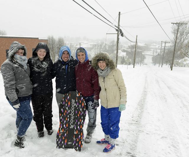 2015-02-17 - Lindsey Wilson College, Columbia, KY - Photo by Duane Bonifer, Lindsey Wilson College. This quintet of Lindsey Wilson College students tried to sled down a snow-covered Lindsey Wilson Hill on Monday morning. From left: Maddie Nance of Slaughters, KY; Bailey Scott of Auburn, KY; Fabricio Morales of Cancun, Mexico; Hannah Hayduk of Kutztown, PA; and Ashli Dickerson of Madisonville, KY. - DUANE BONIFER