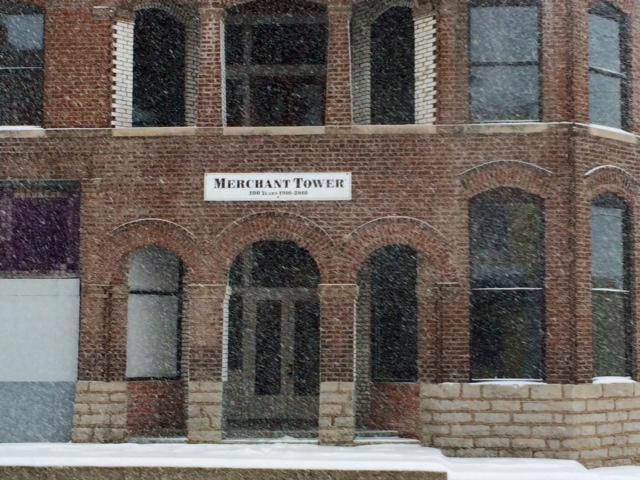 2015-02-17 - 100 E Main Street, Campbellsville, KY - Photo by Larry Smith, FM 92.7 the WAVE; FM 99.9 The Big Dawg. A huge perk in my job is getting to watch the passing parade on Main Street in Campbellsville and watching the street scene. The Merchants Hotel is directly across the street from the Big Dawg. This shot was one of those hidden, unexpected gems photographers don't know they have until they flip through the images, and find they have a scene which may never be replicated, naturally. I hope you like the artistic effect the even fall of snow gave this one. There may be a filter which will give the effect, maybe not. - Larry Smith, Operations Manager, Shoreline Communications