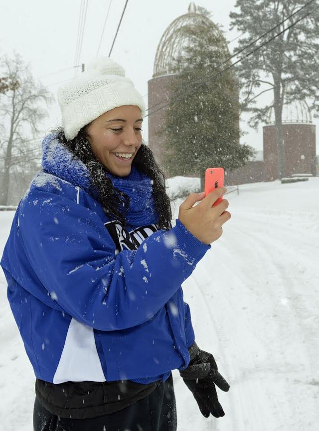 2015-02-17 - Lindsey Wilson College, Columbia, KY - Photo by Duane Bonifer, Lindsey Wilson College. Lindsey Wilson College student Ericka Clifford of Atlanta stands in the middle of Lindsey Wilson Street atop Lindsey Wilson Hill Monday morning, February 16, 2015, while face-timing with her boyfriend, Evan Engram, who is a student at the University of Mississippi. Clifford wanted to show Engram the snow he was missing more than 350 away. - DUANE BONIFER