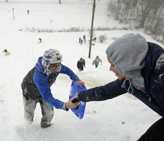 2015-02-17 - Hill by Keefe Hall, 152 Blue Raider Drive, Columbia, KY - Photo by Duane Bonifer, Lindsey Wilson College. Lindsey Wilson College student Maryssa Stewart of Richmond, KY, right, helps fellow student Willard Murrell of Jackson, MI, climb Keefe Hill. Dozens of LWC students sledded down the hill all day Monday, which is behind Keefe Hall on the west side of campus.
