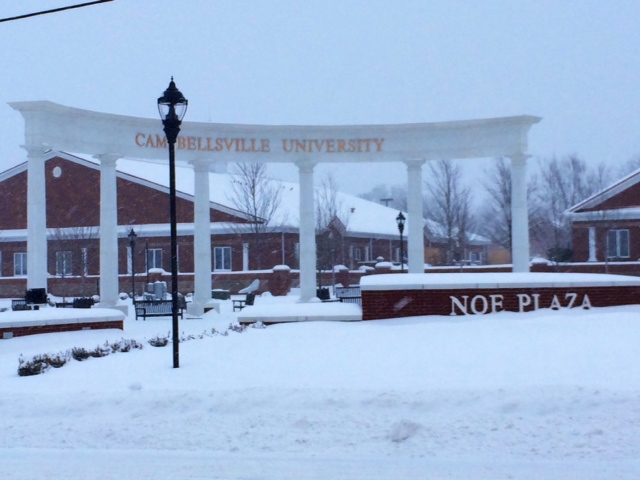 Campbellsville University's campus was a winter wonderland today, Monday, February 16, 2015, this scene is at the University's Alumni & Friends Park, Noe Plaza, at the northwest corner of the Broadway & N Columbia Avenue. - Larry Smith, Operations Manager, Shorelines Communications
