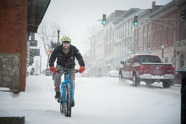 2015-02-16 - Shelbyville, KY - Photo by Pen. As any bike seller will tell you, the best way to get around in the snow is on a fat-tired bike like this Beargrease from Salsa, designed for better stability in mud and snow. This one is ridden by Adair County native Tom Waggener, owner of the opening-any-day-now Small Batch Cyclery in Simpsonville, KY.
