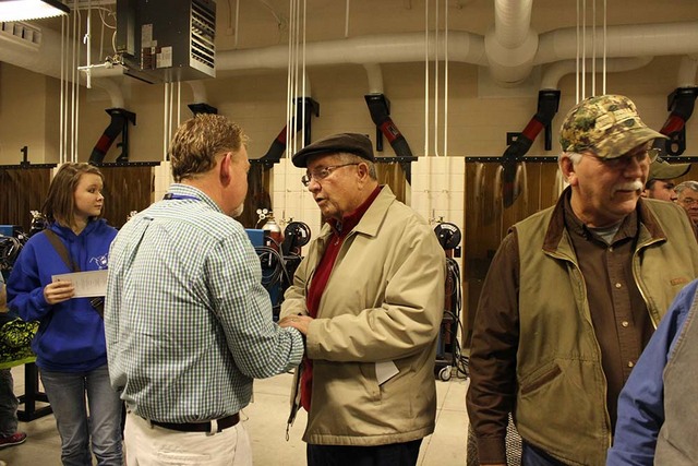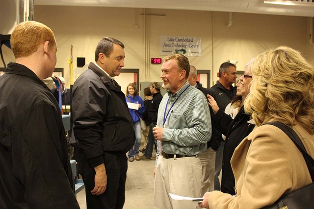 2015-02-10 - Career & Technical Center, 526 Indian Drive, Columbia, KY - Photo by Shamarie Claiborne, Adair Co. School District photo. Former Adair County Judge Executive Richard Lee Walker congratulates Barney Taylor on the new Lake Cumberland Technical School Satellite Campus. One of many handshakes Barney received during the Career and Technical Education Showcase held last night at ACHS. - SHAMARIE CLAIBORNE