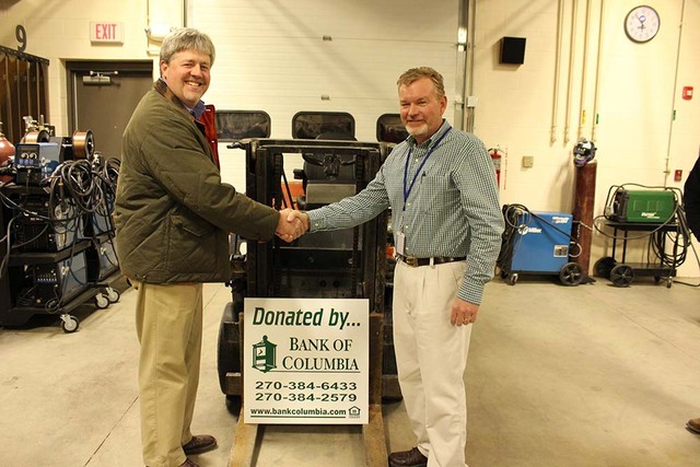 2015-02-10 - Career & Technical Center, 526 Indian Drive, Columbia, KY - Photo by Shamarie Claiborne. Barney Taylor teacher at the Adair County Lake Cumberland Technical School Satellite Campus, right, thanks Mark Dykes from the Bank of Columbia for their generous donation last night at the Career and Technical Education Showcase. - SHAMARIE CLAIBORNE, Adair County School District Media Publicity Coordinator.