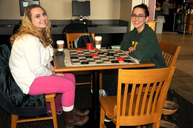 2015-02-09 - Davenport Student Commons, 410 N. Hoskins Avenue, Campbellsville University - Photo by Aigerim Sakieva, CU photo. The checkers table in Davenport Student Commons at Campbellsville University is always a welcome spot, especially on cold winter days. Kaitlyn Clifton of Portland, TN and Mary Kate Shelby from Ridgeland, MS are enjoying a game between classes. CU photo by Aigerim Sakieva from Kyrgyzstan. - Linda Waggener