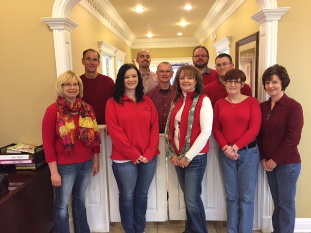 Employees at United Citizens Bank are celebrating National Heart Awareness Month. Today is national "Go Red Day." Front row, from left: Gidget Royse, Amy Bennett, Sandy Corbin, Valerie Thomas, Cathy Lawless. Back row, left to right: Bruce White, Matt Loy, Philip Watson, Woody Sharpe and Joe Collins. Photo by Jennifer Coomer