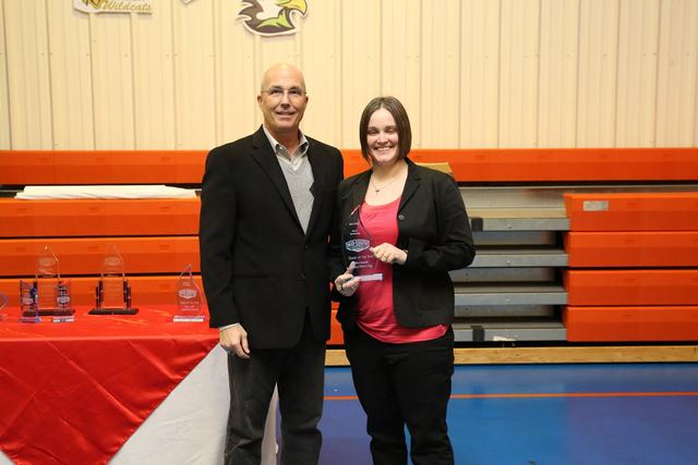 LWC coach Alicia Kemnitz right, is presented with the MSC Men's Swimming Coach of the Year award by MSC Commissioner Eric Ward
