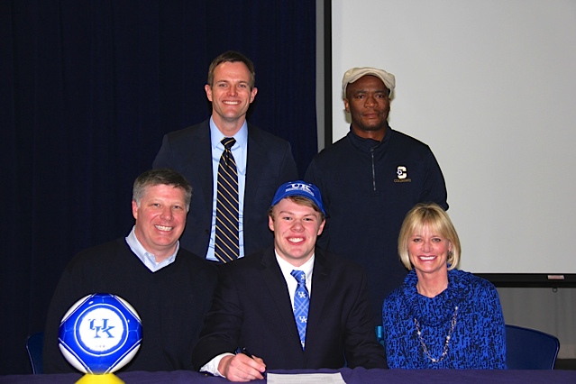 2015-02-05 - Louisville Collegiate School, 2427 Glenmary Drive, Louisville, KY - Photo submitted by Jamie Harper White. National Signing Day, UK Soccer Front row, center Donna Harper & the late Jimmy F. Harper of Columbia's grandson, Harper Sutherland White, center, at signing ceremony in Louisville, KY, on National Signing Day, Tue 4 Feb 2015. With him, front row, are his father, Richard White, UK goalkeeper 1982-84, and right, Jamie White, (not Donna Harper, but an exact clone). Standing are Brad Davies, Harper White's coach at Louisville Collegiate School, and Thabane Sutu, Lifetime Goalkeeper Coach.