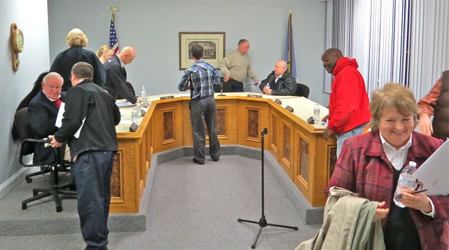 2015-02-03 - City Hall Council meeting room, 116 Campbellsville Street, Columbia, KY - Photo by Ed Waggener. After the brief City Council meeting, dominated by voice votes on a total of 14 appointments and reappointments, a couple of "something's got to be done" discussions on clean ups and the phone forwarding for incoming calls to the Police Department, there was a lot going on after adjournment. Clockwise, above, Larry Smith of the WAVE interviews newly appointed and approved Mayor Pro Tem Ron Rogers; Council members Charles Grimsley and Mark D. Harris; City Clerk Rhonda Loy; Duo-County videographer Ramie Hutchison picking up audio equipment; Mayor Curtis Hardwick in a discussion with City Attorney Marshall Loy; Councillor Craig Lesley, just enjoying the show; and Council Member Linda Waggener. Click on ReadMore for the full report, posted immediately after the meeting