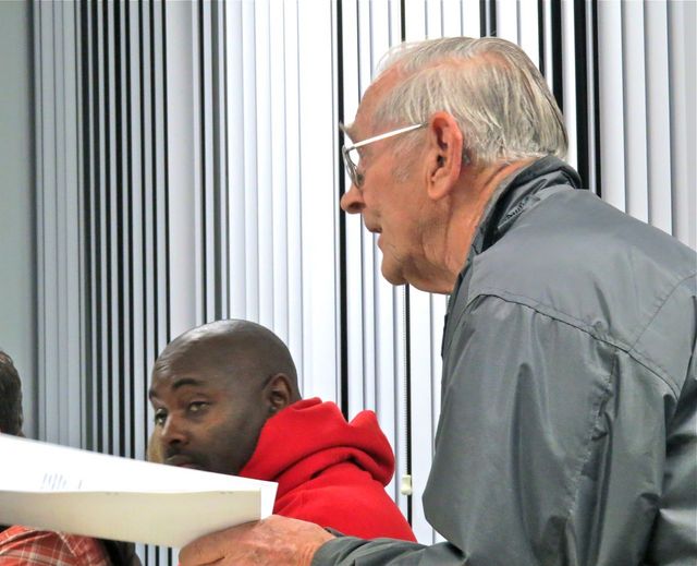 2015-02-03 - City Hall Council meeting room, 116 Campbellsville Street, Columbia, KY - Photo by Ed Waggener. Citizen Bill Anderson appeared before the City Council to requested that something be done about what he perceives as eyesores in the community: The forest next to Dreamland; and what he called a junkyard on Tutt Street. Mayor Hardwick and Mayor Pro Tem Ron Rogers told him that the current laws do not have teeth in them, but that they have plans to make them more punitive. In the background, Councillor Craig Lasley listens.