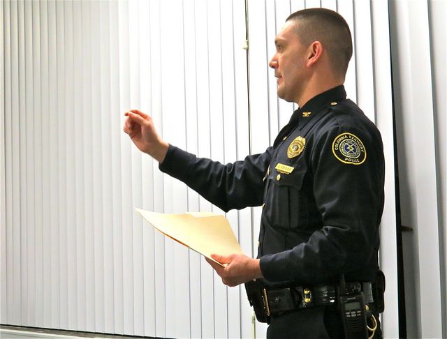 2015-02-03 - City Hall Council meeting room, 116 Campbellsville Street, Columbia, KY - Photo by Ed Waggener. After Councilman Ron Rogers asked that something be done about complaints he has been receiving from citizens who could not get an answer when calling directly to the Columbia Police Department Chief Jason Cross rose to explain that the problems existed because the department does not have a secretary and because the Police Department is on a different phone system from City Hall. The photo was taken at the Monday, 2 Feb 2015 meeting of Council. Mayor Hardwick and City Clerk Rhonda Loy are looking into the problem and felt that a solution could be worked out shortly. City Hall's number is 270-384-2501. Calls are answered by real people, and transfers to individuals and to other departments are handled in a personal manner. The Police Department's administrative number is 270-384-4119; emergency calls for the police department are handled by Adair County 9-1-1 Center. See also: Columbia Police Department Activity Report, Jan. 2015 which was presented to the public at the Mon 2 Feb 2015 meeting.