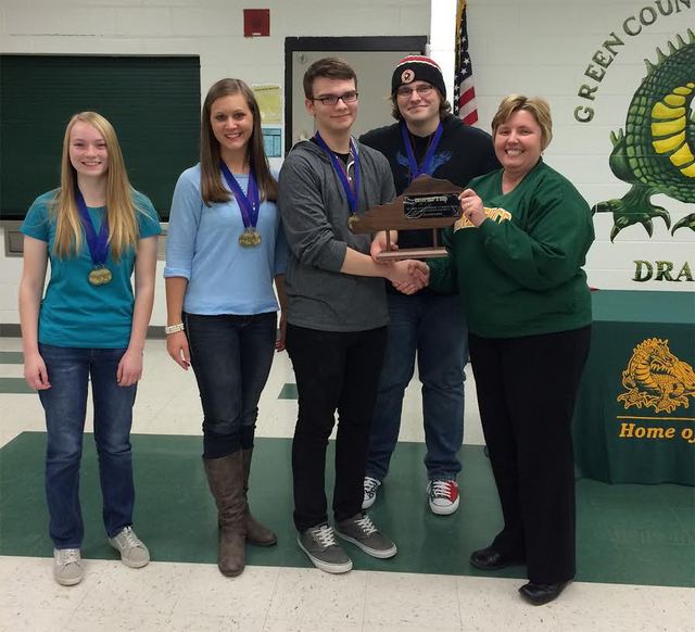 2015-01-29 - Greensburg High School, 302 Brummal Avenue, Greensburg, KY - Photo by Shamarie Claiborne, Adair Co. School District . Decade of Dominance/Governor's Cup: Rebecca Montgomery, Brittany Curry, Eli Jackson and Timothy Watson are show here accepting the ACHS 2015 Governor’s Cup District Championship trophy. - Shamarie Claiborne