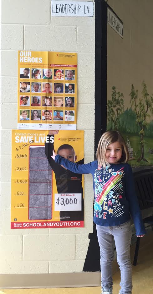 2015-01-29 - Adair County Primary Center, 158 Col. Casey Drive, Columbia, KY - Photo by Patty Jones, Principal. Reese Bardin is pictured with the "Goal Poster" for Adair County Primary Center's recent Pennies for Patients campaign to benefit the Leukemia and Lymphoma Society. The school set a goal of $3000 and topped it by raising $3,361.00 to donate to the group. This effort started for the school at Col. Wm. Casey three years ago when Blane Bardin, Reese's brother, was a first grader. Blane is a leukemia survivor and one of our own local heros. Thanks to Reese for keeping the spirit alive at ACPC now that Blane has moved on to ACES!! Thank you to all of our students, parents and community members who donated and supported this worthy cause. - Patty R. Jones, Principal, Adair County Primary Center, 158 Col. Casey Drive, Columbia, KY 42728
