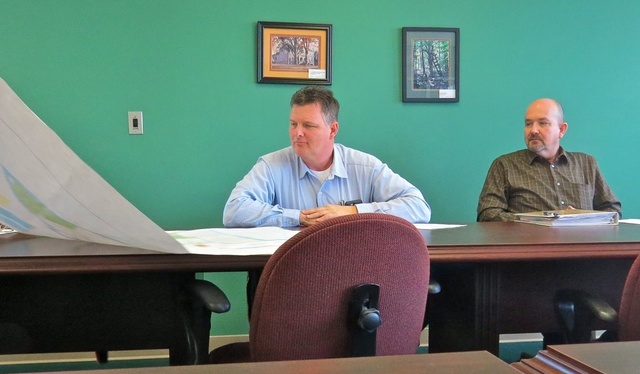 2015-01-21 - 201 Burkesville Street, Columbia, KY - Photo By Ed Waggener . Columbia-Adair County Economic Development Authority board members Anthony Janes, left, and Tony Corbin, reviewed plans from several years ago for the Green River Commerce Park, which CACEDA Chair Dan Antle brought to the Tue 19 Jan 2015 meeting of the board.. At that time, a portion of the acreage was reserved for a park. The authority and Judge Stephens and Deputy CJE Holly Grimsley are moving ahead with plans for a Build-Ready Pad as well as a comprehensive plan for the entire park. Judge Stephens is optimistic that the park will gain statewide and beyond focus when the parkway segment between Campbellsville and Columbia is constructed - and suggests that 2015 might be the year construction begins.