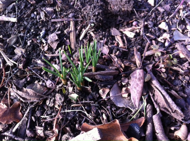 2015-01-21 - Harrodsburg, Mercer County, KY - Photo by Mike Watson. CM's Crocus-in-Bloom Watch is stilll on - but Historian/Plant Diarist Mike Watson sent photos on 19 Jan 2015 of these sprouting crocus, and note from his and Renea Watson's memories. He wrote with this photo, " just saw the photos of sprouts from an earlier date. Here are three taken this morning. They have been up several days; Renea says we first talked about them last Saturday week, which would have been January 10th, a bitter cold, windy day." MW