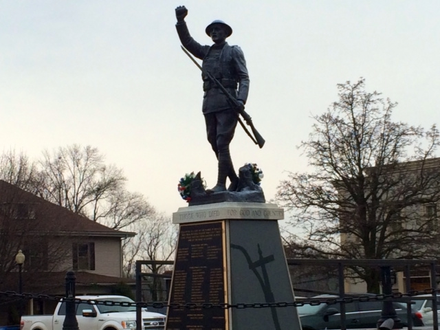 2015-01-16 - Monument Square, Jamestown, KY - Photo by Larry Smith, FM 92.7 the WAVE. Winter skies cast the Doughboy statue, for which the square gets its name, in a dramatic light. - Larry Smith, Operations Manager, ShorelineCommunications, Jamestown, KY.