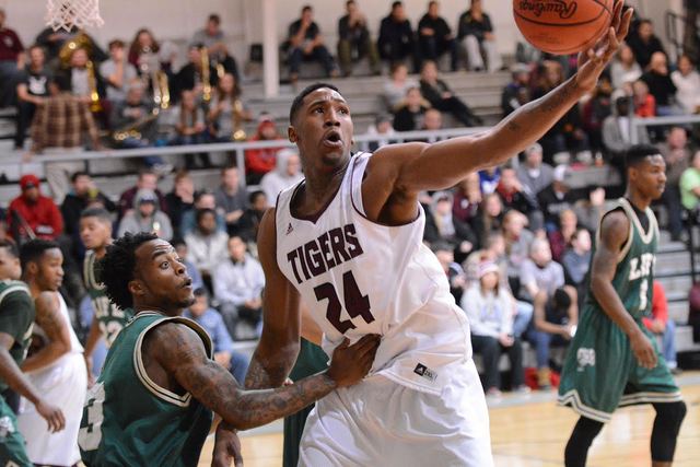 2015-01-16 - Powell Athletic Center, 203 Tiger Way, Campbellsville, KY - Photo by Richard RoBards, CU photo. Campbellsville University's Senior transfer Damontre Harris (Florida) posted the Tigers' first-known triple-double in program history with 11 points and career-highs 19 rebounds and 11 blocks. A dozen of his boards came on offense. He also added five steals. Harris, above, in Campbellsville's 83-72 victory over Life University, Thursday, January 15, 2015, before a home crowd of 950. The team is currently ranked No. 1 in the NAIA. from Chris Megginson, Campbellsville University