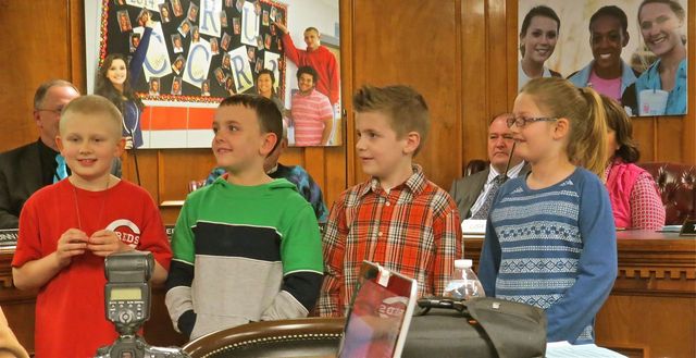 2015-01-16 - 1204 Greensburg Street, Columbia, KY - Photo by Ed Waggener. Students at Adair County Primary Center, kicked off the Thu 15 January 2015 Adair County School Board meeting with a hard-act-to-follow performance. From left are Zachary Freels, Zackary Burton, Blake Mauldin, and Millie Brown. The kids led the pledge of allegiance, and Zachary Freels sang the specially written ACPC "7 Habits" song to the delight of the board and the audience. Zackary Burton, Blake Mauldin, and Millie Brown have their eyes on their oh-so-proud principal, Patty Jones. In the background are Superintendent Alan W. Reed; Board Chair Floyd Burton (Div 4) plaid shirt, barely visible; Board Attorney Jeff Hoover, and Lisa Burton (Div 3) Board Member. - EW