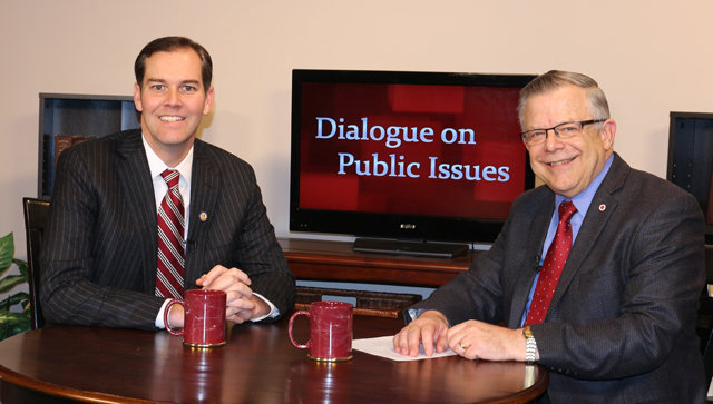 Campbellsville University's Dr. John Chowning, vice president for church and external relations and executive assistant to the president of CU, right, interviews Max Wise, Kentucky State Senator for Adair, Clinton, Cumberland, McCreary, Russell, Taylor and Wayne counties, for his "Dialogue on Public Issues" show. The show will air Monday, January 19 at 1:30pmET and 6:30pmET and Wednesday, January 21 at 1:30 pmET and 7pmET on WLCU-TV, on Campbellsville's cable channel 10 and at 8 amET and at 6:30 pmET Sunday, January 18 on both WLCU-TV and on 88.7 The Tiger radio. JOAN C. McKINNEY