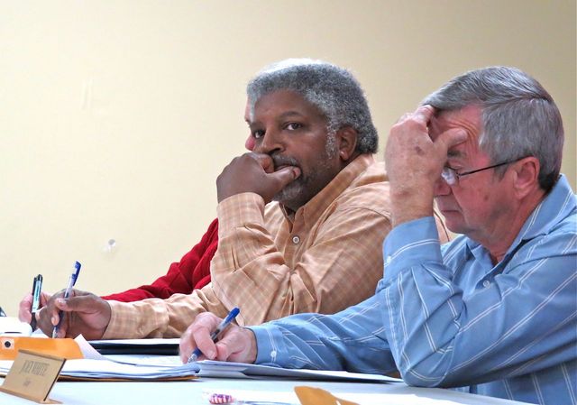 2015-01-14 - Adair Annex, 424 Public Square, Columbia, KY - Photo by Ed Waggener. Terry Hadley (7) blue shirt, right, and Greg Caldwell (6) plaid, at the Adair Fiscal Court meeting, Tuesday, 13 January 2014. For Terry Hadley, in deep thought above it is a second term and last night he got the opportunity to participate in the completion he played a key role in getting started seven years ago - the Senior Citizen's Center. Caldwell is a first term magistrate. He's the first African-American ever to sit on the court. He's was also the first African-American ever to sit on the Adair County School Board. And he and CJE Mike Stephens share another distinction. They both succeed in a rare feat, getting electing to a county wide office after serving on the school board. At far right mostly hidden is the senior member of the court, Billy Dean Coffey, who is second in line of succession, following Deputy CJE Holly Grimsley, should the CJE be unable to perform the duties of the office. - EW