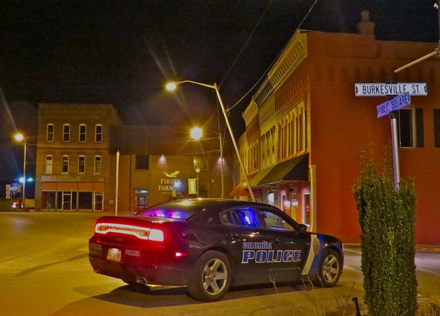 2015-01-14 - Burkesville Street at Public Square, Columbia, KY - Photo by Ed Waggener. Columbia City Police were protecting the area around a lamppost which was clipped at its base by a Campbellsville bound semi at around 9pmCT, Wed 14 Jan 2015. Ofc. Jordan Dean said that the policeman will limit traffic near the scene until a technician from KU arrives to make repairs. the lamp standard is held in place only by electrical lines. There is a concern that if the support gave way it would almost certainly take out other lamp posts. The photo was taken at around 10pmCT. - EW