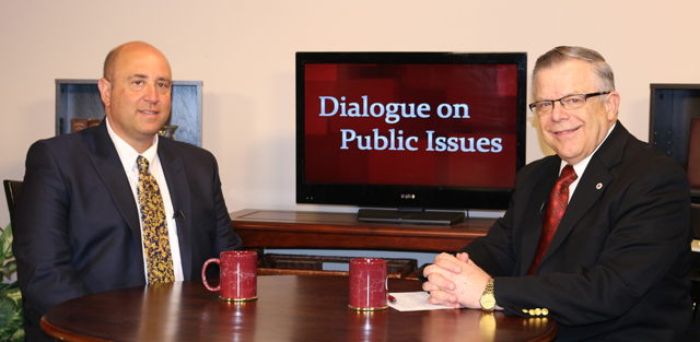 Campbellsville University's Dr. John Chowning, vice president for church and external relations and executive assistant to the president of CU, right, interviews Jonathan Steiner, executive director and chief executive officer of the Kentucky League of Cities in Frankfort, KY, for his "Dialogue on Public Issues" show. The show will air Monday, January 12 at 1:30pmET and 6:30pmET and Wednesday, January 14 at 1:30 pmET and 7pmET on WLCU-TV, on Campbellsville's cable channel 10 and at 8 amET and at 6:30 pmET Sunday, January 11 on both WLCU-TV and on 88.7 The Tiger radio.