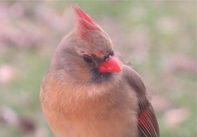 2015-01-07 - Columbia, KY - Photo CM staff photo. A Lady Cardinal - so beautifully attired and appreciated so much more when her garish spouse is not around. A visitor at the feeder today, Wed 7 Jan 2015.
