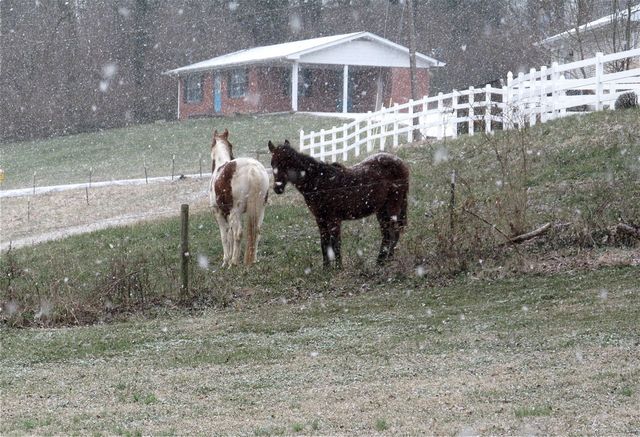 2015-01-07 - On Town Creek, Columbia, KY - Photo by Ed Waggener. At 8:30amCT Wed 7 Jan 2015, , snow dappled sentry horses kept weather eyes out, one on us, the other on Hurt Street, as a sincere snow shower started. Fortunately, the horses have a warming station in the barn, plenty of water, and plenty of hay and feed just yards away. - EW