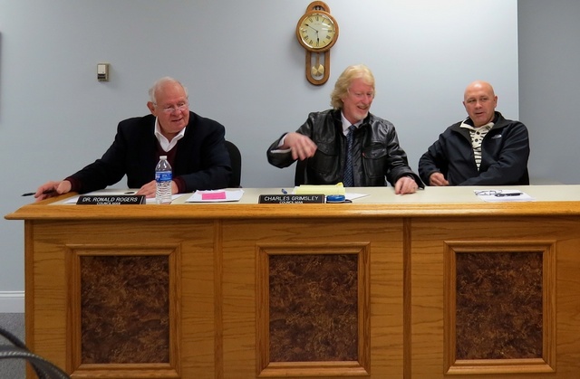 2015-01-06 - City Hall, 116 Campbellsville Street, Columbia, KY - Photo by Linda Waggener. With ten minutes to go before the start of the Mon 5 Jan 2015 regular session of the Columbia City Council the three members sitting on the left bank were in a lighter mood before the session began. From left, they are Dr. Ron Rogers, Charles Grimsley, and former Mayor, former Police Chief, and father of Baily Harris, Cindy Harris' husband, seated where long time Council Member June Parson sat for many years. Parson did not seek re-election as Councillor, running instead for Mayor.