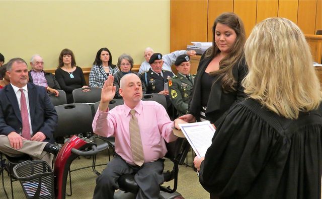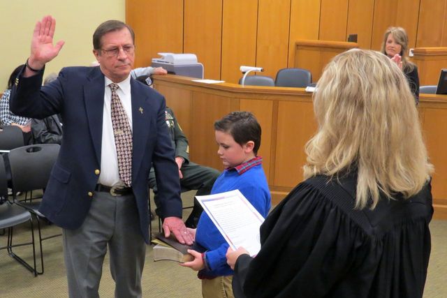 2015-01-06 - Adair County Judicial Center, 201 Campbellsville Street, Columbia, KY - Photo by Ed Waggener. Circuit Judge Judge Vance, administered the oath of Office for Constable Bill Troutwine, Adair County District 1. Holding the Bible is Trey Stephens.