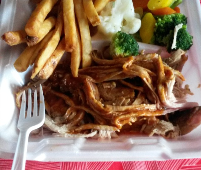 2015-01-04 - Carlisle, AR - Photo by Big Al Owens, Big Rig Trucker. Big Al writes, "Pulled pork, with steamed vegetables and french fries, from Nicks BBQ in Arkansas. Delicious!"