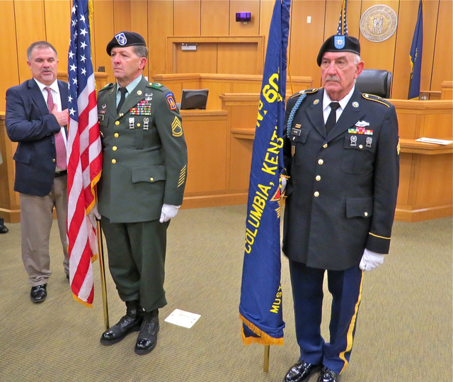 Adair County VFW Post 6097 Color Guard, Ron Holt, left, and Commander Joe Hare, at attention as State Rep. John BAM Carney leads the pledge of allegiance at the 2015 Swearing In Ceremonies today, Sunday, January 4, 2014