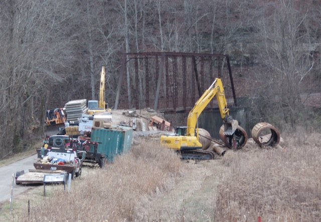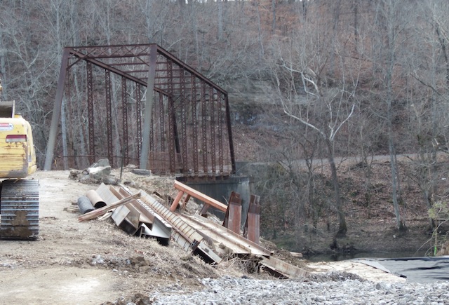 2015-01-02 - Tebbs Bend Bridge, Taylor County, KY. - Photo by Lawrence Hamilton. Lawrence writes, "The destruction and reconstruction of the Tebbs Bend Iron Bridge over the Green River. Some of the crew was working New Year's Day, getting it ready to relocate." A new bridge will be constructed at the famous landmark span.