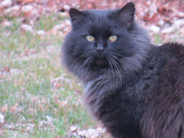 2015-01-03 - Fortune Street, Columbia, KY - Photo by Linda Waggener. The Black Cat is so aloof we wonder if it has a home. It regularly passes by, and begs for food, it makes eye contact from a distance, but never offers to talk the way others do. It takes cautiously takes handouts, but then, the best fed neighborhood cats to that. We always wonder what the rest of its story is. A pampered pet of one or more families? Or a super survivor? - CM