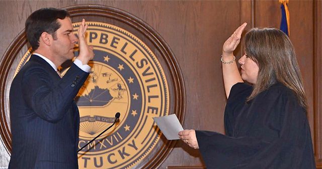 2015-01-03 - Campbellsville Civic Center, 205 N Columbia Avenue, Campbellsville, KY - Photo by Drew Tucker, Campbellsville, KY. . Max Wise, elected to the State Senate from 16th Senate District on November 4, 2014, took the oath of office administered by District Judge Amy Anderson who serves Marion, Green, Taylor and Washington Counties, at the Civic Center in Campbellsville, KY, on Friday, January 2, 2014. Senator Wise' district includes the Counties of Adair, Clinton, Cumberland, McCreary, Russell, Taylor, and Wayne Counties. Wise is a former FBI analyst, and is an assistant professor of Political Science and International Studies at Campbellsville University. - CM. Paired Photo. See also: Senator Max Wise speaks after taking oath of office